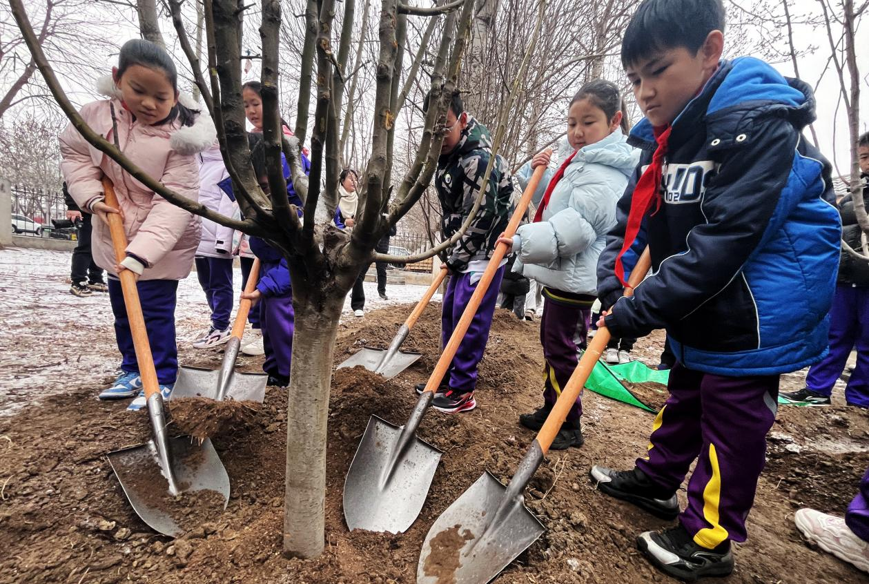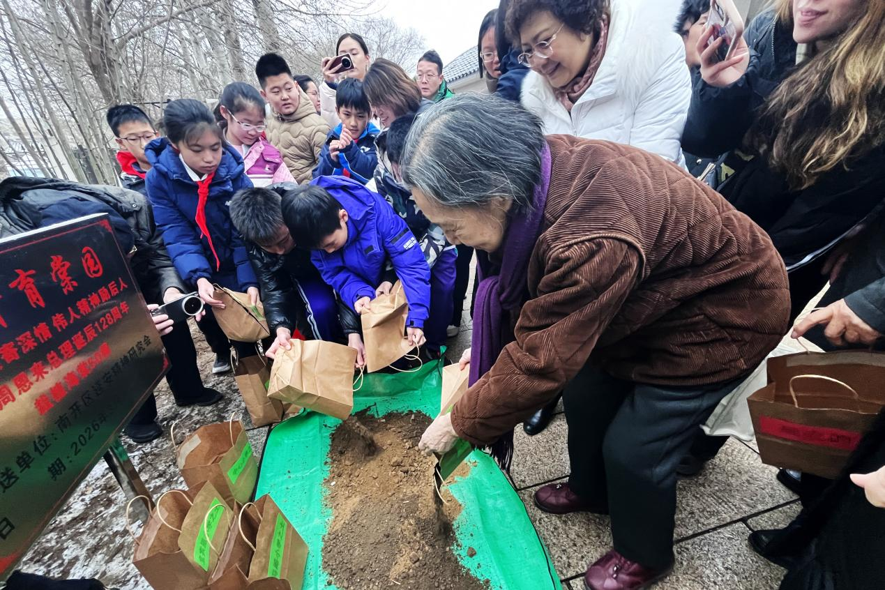 随后,全体与会人员在纪念馆红色文化长廊南侧栽植50棵海棠树苗,表达对周恩来总理逝世50周年的深切缅怀。在植树现场,与会嘉宾和少先队员们把取自延安的黄土和取自南开大学、南开中学以及参加活动的南开区十二所学校校园的土汇合在一起,培撒在新栽种的树苗上,以此方式表达新时代青年继承周总理遗志、为中华之崛起而读书的坚定决心。