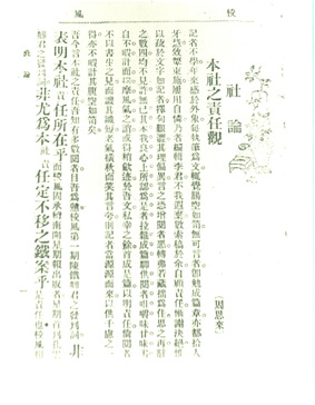 1917年5月,周恩来在即将毕业之际写了一篇长文,题为《本社之责任观》,在《校风》上分六期连载。这篇文章总结了《校风》的办刊经验,提出了办刊的基本责任,并对如何办好《校风》提出了许多好的建议。作为编辑部纪事类总主任的周恩来,对编辑部的工作首先强调《校风》是全校的机关报,“同学皆负责之人”,要办好《校风》,必须依靠群众,因为“一人之精神有限,千人之事业无垠”,只靠“编辑数人,同学均袖手旁观,其内容逐日形艰窘”。周恩来认为,作为由学生自己主办的校报,应当担负起学生对于学校的责任“学生于学校之责任,舍读书、励行、健身外,尤有建议之义务”。周恩来还认为“今日之学生是未来社会中心之人物”,只有在学校期间养成关心学校、热爱集体的优良作风,才能担负起对未来社会的责任。他还严厉批评了在一部分同学中存在的那种“独善其身,自鸣清高”的不良倾向。