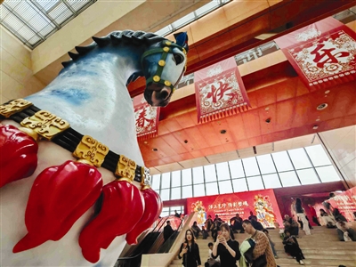 行走在展厅中,民俗与科普的融合巧思随处可见。“这是本次展览的创新亮点,场馆特意在展陈中融入泥人张马形泥塑、马主题年画、马元素剪纸,布展时更将马的剪影放大融入整体设计,让硬核科普多了传统文化韵味。”王欣表示。