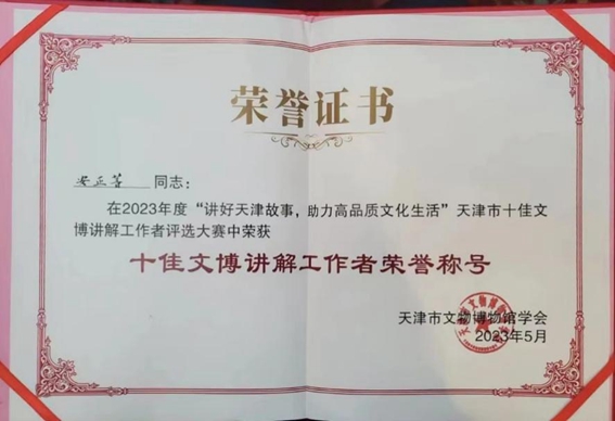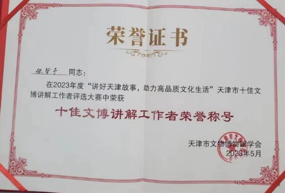 今年国际博物馆日前夕,我市举办了2023年度“讲好天津故事,助力高品质文化生活”天津市十佳文博讲解工作者评选大赛。我馆专业讲解员张馨予及志愿者讲解员安正菁等两人从激烈的竞争中脱颖而出,荣获“2023年度天津市十佳文博讲解工作者”荣誉称号。