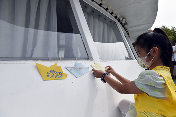 “新海门”号船舶是纪念馆新征集的体量最大的一件文物,1992年,它执行了将邓颖超骨灰撒入海河的任务,此后,这艘船又多次完成邓颖超逝世日的纪念追思活动。“新海门”号退役后,于2021年正式落户于周邓纪念馆,让更多的观众感受邓颖超博大无私的胸怀和天津人民对她的深情厚谊。营员们登上“新海门”号,认真观看电视片,他们还在讲解员的带领下,在彩纸上写下一句自己最想对周爷爷、邓奶奶说的话,将纸折成小船,放在“新海门”号船舶上,阵阵清风吹入船舱,仿佛两位伟人听到了孩子们缅怀敬仰他们的心声。